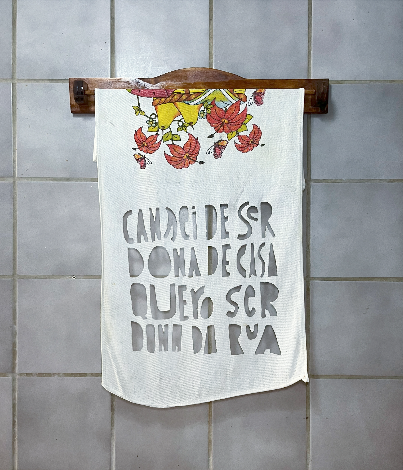 A frase foi registrada ao destruir um pano de prato que estava ali, naquela mesma cozinha, de um jeito que a mensagem não pudesse ser apagada nem desfeita. Como a própria frase, que depois de dita segue ecoando.