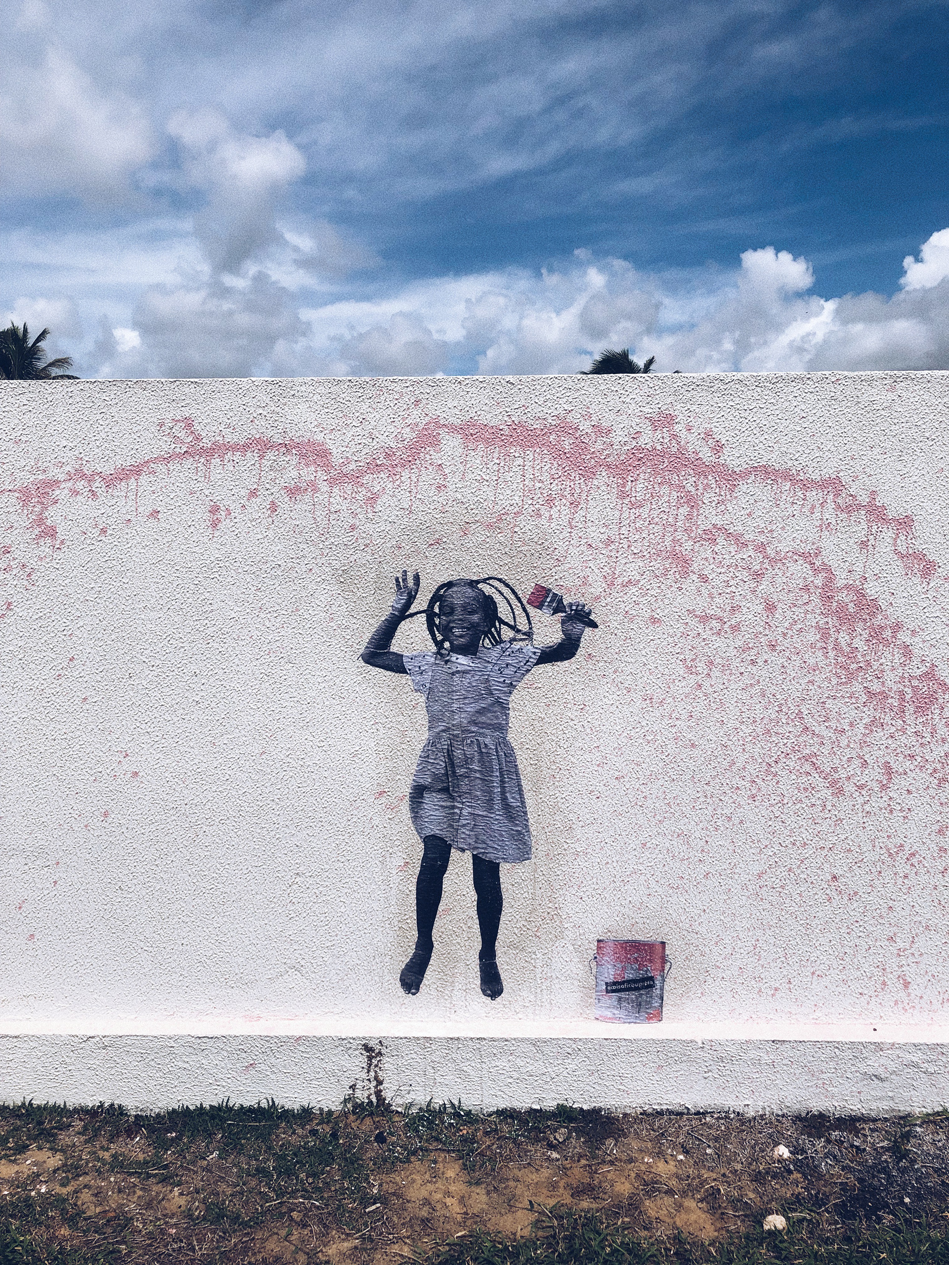 A obra foi uma intervenção em uma parede que estava com respingos de tinta rosa.